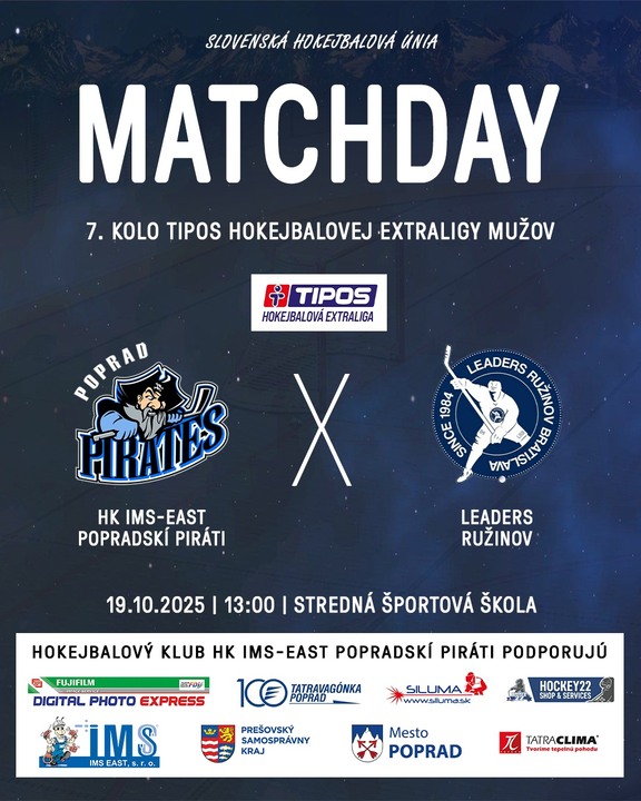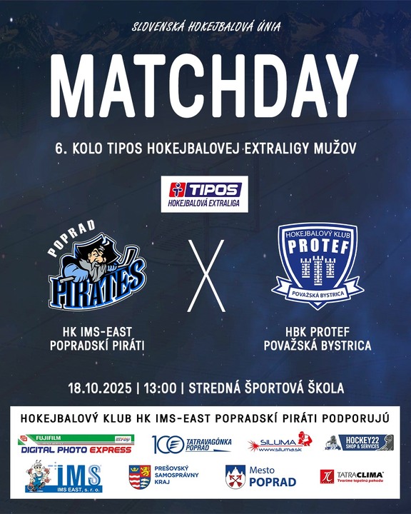 18.10.2025 HK IMS-EAST Popradskí Piráti vs. HBK PROTEF Považská Bystrica Popradskí hokejbalisti privítajú doma v rámci 6. kola hokejbalovej Tipos Extraligy tím HBK PROTEF Považská Bystrica. Zápas sa odohrá v sobotu 18. októbra o 13. hodine v hale Strednej športovej školy v Poprade. 19.10.2025 HK IMS-EAST Popradskí Piráti vs. Leaders Ružinov Popradskí hokejbalisti privítajú doma v rámci 7. kola hokejbalovej Tipos Extraligy tím Leaders Ružinov. Zápas sa odohrá v nedeľu 19. októbra o 13. hodine v hale Strednej športovej školy v Poprade.