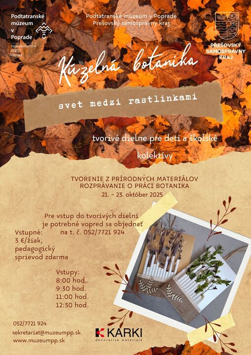 KÚZELNÁ BOTANIKA – svet medzi rastlinkami / tvorivé dielne pre deti a školské kolektívy 21. – 23. október 2025 / utorok - štvrtok/ 8:00 – 13:00 hod. Tvorivé dielne pre deti a školské kolektívy. V tvorivých dielňach sa spoločne ponoríme do tajomstiev zelenej ríše, budeme tvoriť z prírodných materiálov a odhalíme, aké poklady skrýva lúka či les. Čaká nás hravé učenie, tvorenie vlastnými rukami a dobrodružstvo, pri ktorom sa príroda stane našou kamarátkou😊