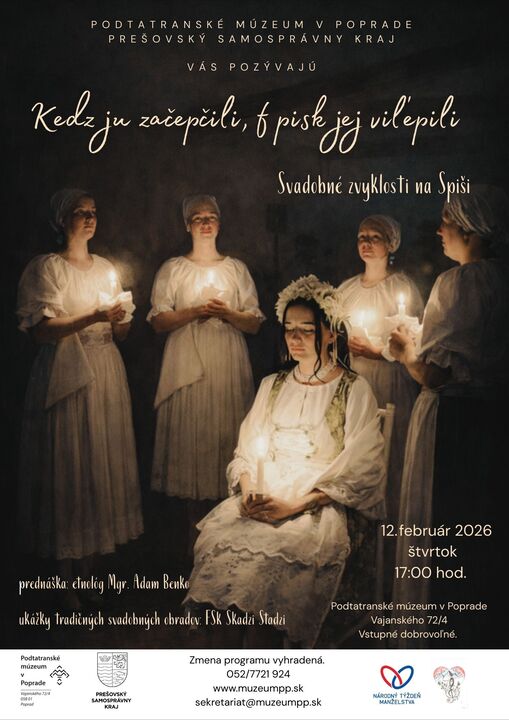 KEDZ JU ZAČEPČILI, F PISK JEJ VIĽEPILI“ - SVADOBNÉ ZVYKLOSTI NA SPIŠI / prednáška etnológa Mgr. Adama Benka a ukážky tradičných svadobných zvykov, piesní a obradov folklórneho súboru Skadzi Stadzi 12. február 2026 /štvrtok/ 17:00 hod.