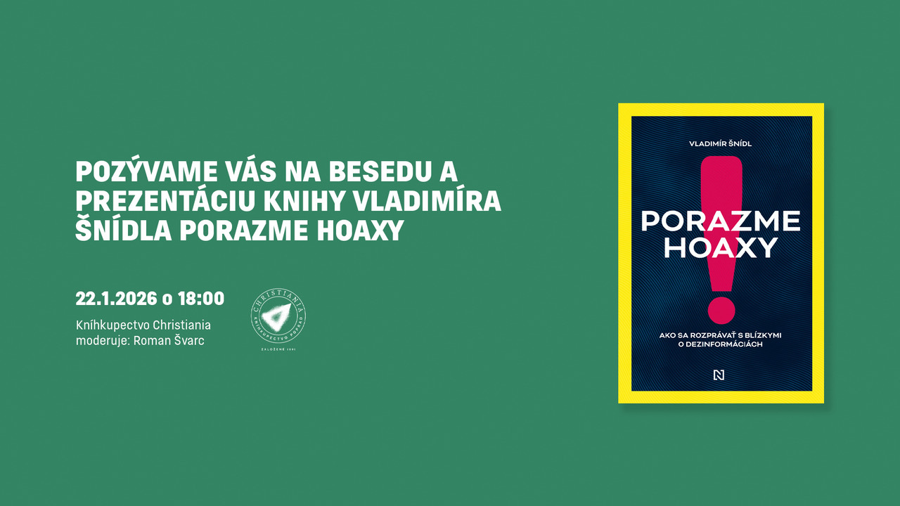 Pozývame vás na diskusiu s novinárom a reportérom Denníka N Vladimírom Šnídlom, autorom knihy Porazme hoaxy!, ktorá ponúka praktický a zrozumiteľný návod, ako komunikovať s ľuďmi, ktorí podľahli dezinformáciám či konšpiračným teóriám.