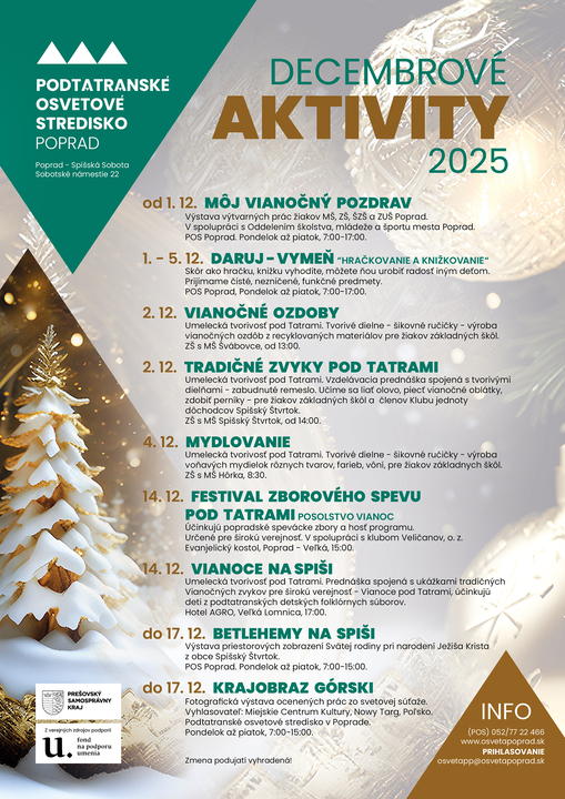 Oddýchnite si v predvianočnom naháňaní, príďte si: zaspievať spoločne koledy, vypočuť vianočné vinše aj dávno zabudnuté zvyky a tradície predvianočného a vianočného obdobia