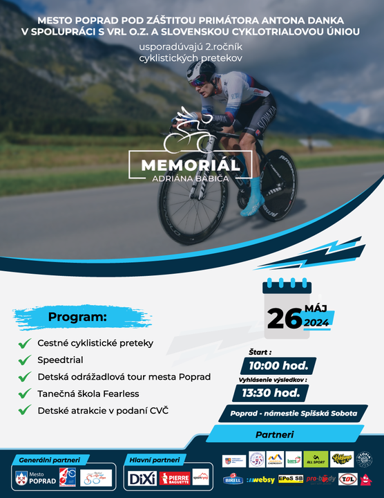 The city of Poprad under the auspices of Mayor Anton Danko in cooperation with VRL and the Slovak Cycling Union are organizing the 2nd annual Adrián Babič Memorial cycling race. The important sports event will take place on Sunday, May 26, 2024, starting at 9:45 a.m. and the start of the main discipline at 10:00 a.m. on the square in Spišská Sobota.