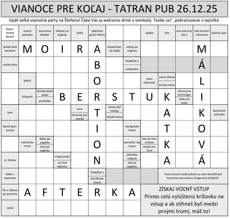 Vylúšti správne celú krížovke z plagátu. Môžeš ju dostať na iných Koľajovských eventoch v papierovej podobe, alebo si ju vytlač alebo vyplň v telefóne. Prví traja ktorí sa ňou preukážu na vstupe, majú voľný vstup.