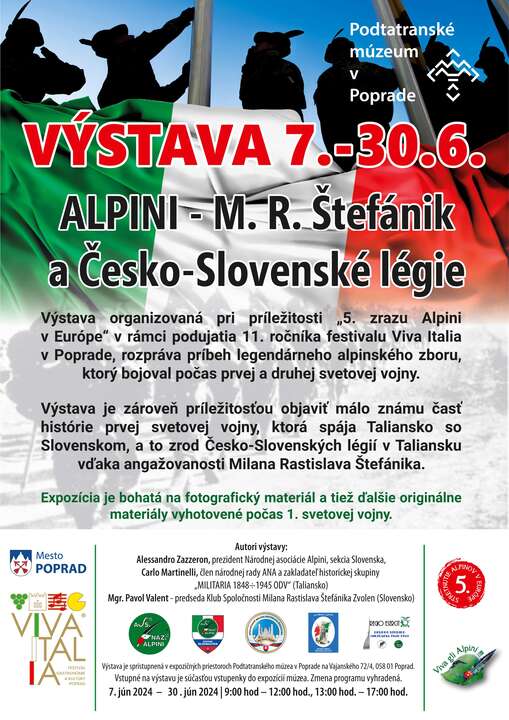The exhibition is organized on the occasion of "5. meeting of Alpini in Europe" as part of the events of the 11th edition of the Viva Italia festival in Poprad, tells the story of the legendary Alpine choir that fought during the First and Second World Wars. The exhibition is also an opportunity to discover a little-known part of the history of the First World War, which connects Italy with Slovaks - the birth of the Czechoslovak legions in Italy thanks to the involvement of Milan Rastislav Štefánik, who fought alongside the Alpine troops near the Piave during this war.