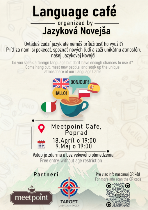 Príď si len tak priateľsky pokecať v cudzom jazyku – bez stresu, bez učebníc, jednoducho medzi sebou pri káve alebo čaji. ☕🌍 👉 Stačí dobrá nálada a chuť rozprávať. Nezáleží, či vieš len pár slov alebo si už pokročilý – každý je vítaný.