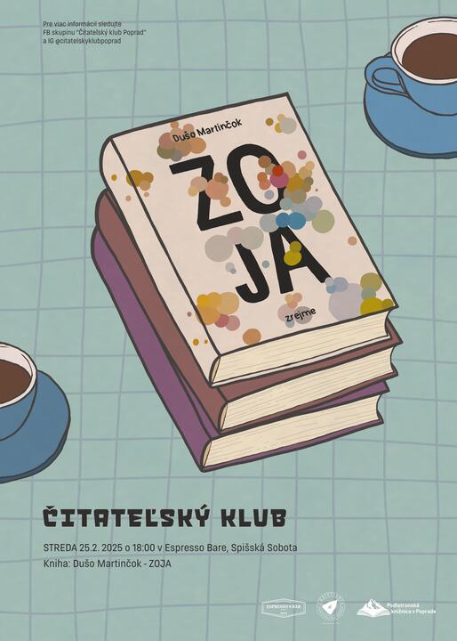 Tento mesiac sa budeme rozprávať o knihe Zoja od Duša Martinčoka. Diskusia prebieha v samostatnej miestnosti kaviarne Espresso bar v Spišskej Sobote. Vítaní sú aj noví členovia.